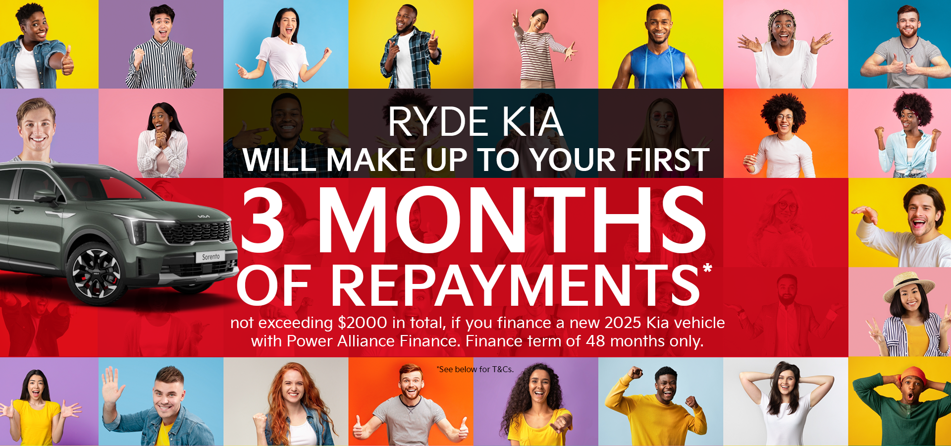 Ryde Kia will make up to your first 3 months of repayments*, not exceeding $2000 in total, if you finance a new 2025 Kia vehicle with Power Alliance Finance. Finance term of 48 months only.